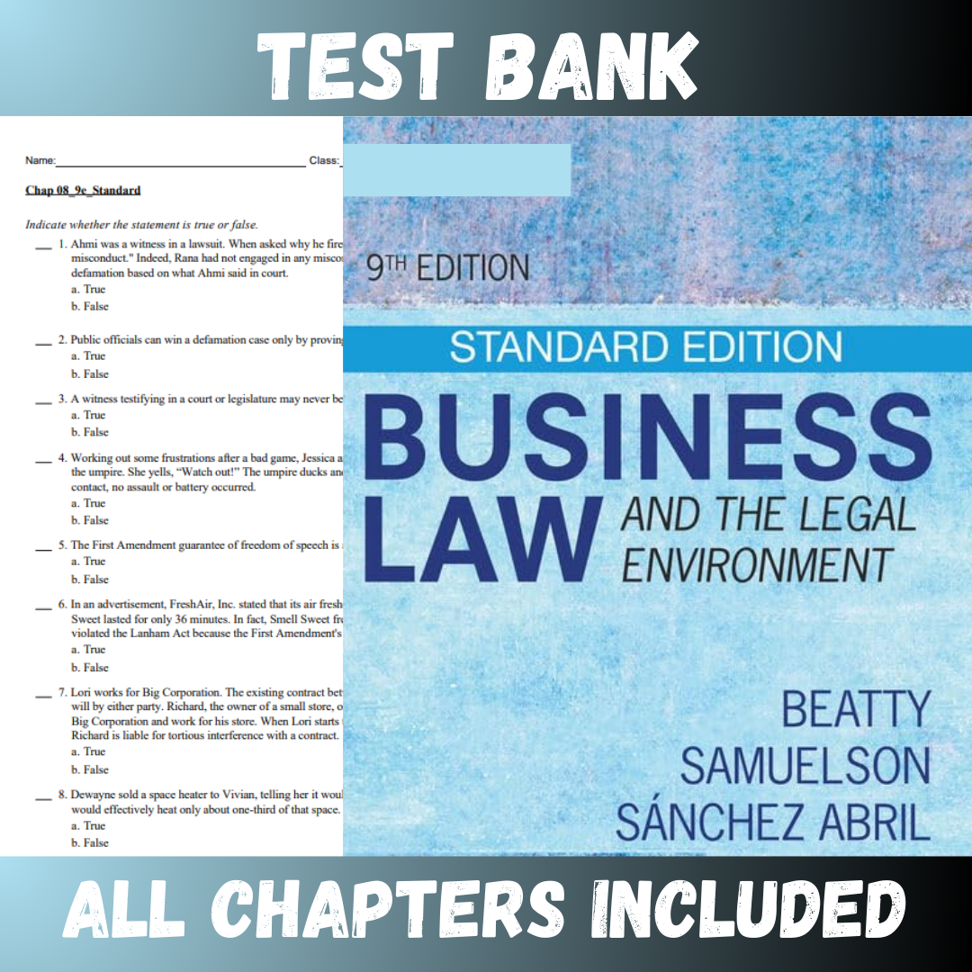 Test Bank for Business Law and the Legal Environment (MindTap Course List) 9th Edition (Jeffrey) | All Chapters