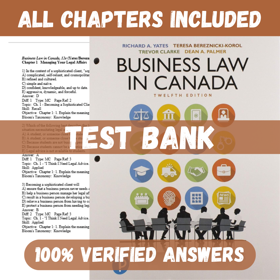 Test Bank for Business Law in Canada, 12th Canadian Edition, 12e Richard Yates