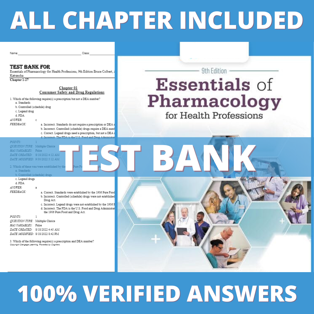 Test Bank for Essentials of Pharmacology for Health Professions 9th Edition (Colbert, 2023)